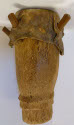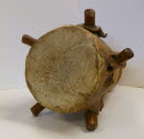 DescriptionOf coconut palm (?) wood. Head at one end only, covered with skin still retaining some of animals short tan hair, held taut by 5 hewn pegs driven diagonally down into side of drum. Opposite end is smaller and carved with two onramental ridges 7cms and 9cms from the bottom, hole in bottom, for resonance.